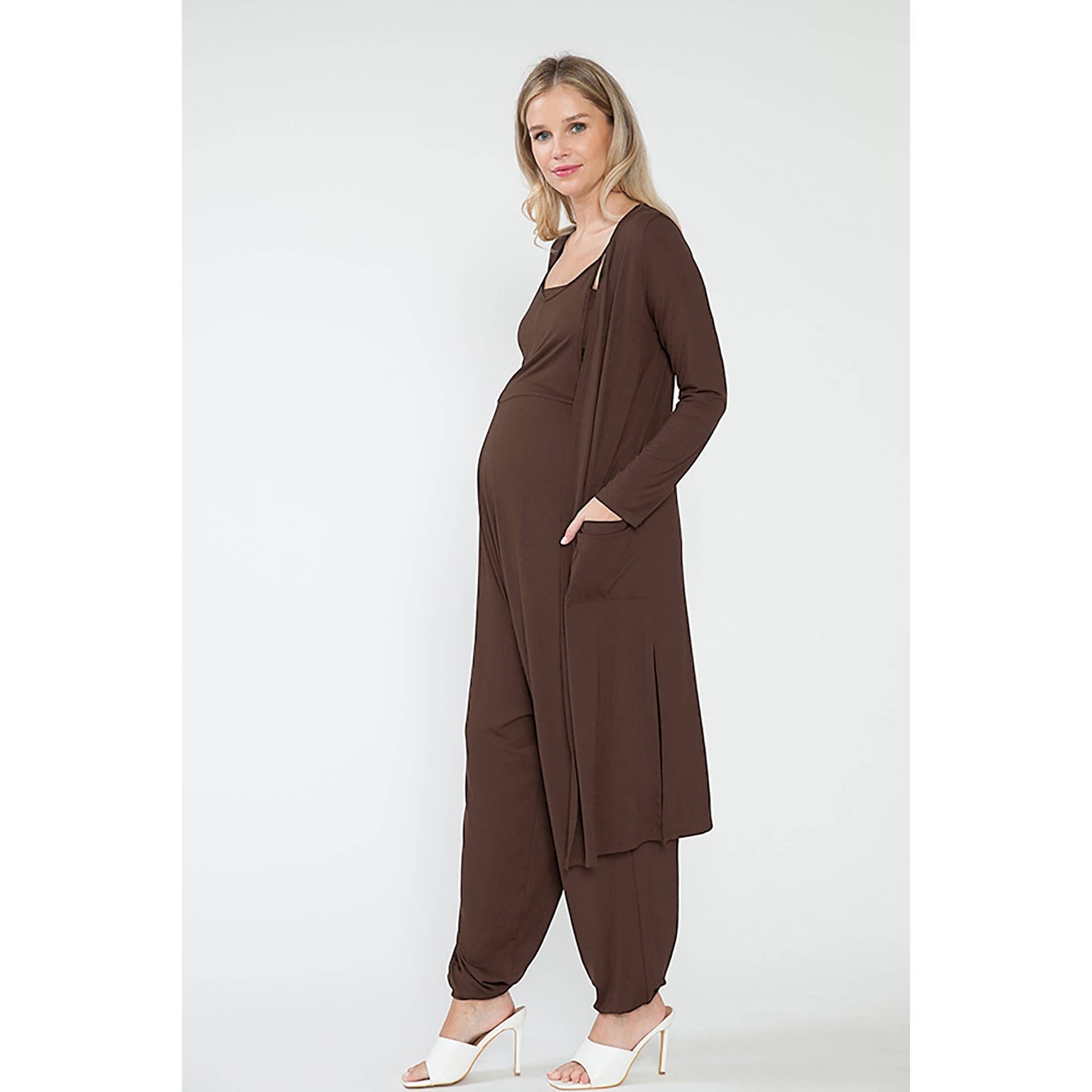 How about a comfy combo of a jumpsuit and a long cardigan for expecting mums? This loose fit set has all the pockets you need for ultimate convenience. This one even comes with a bandeau (matching of course) to wear underneath!