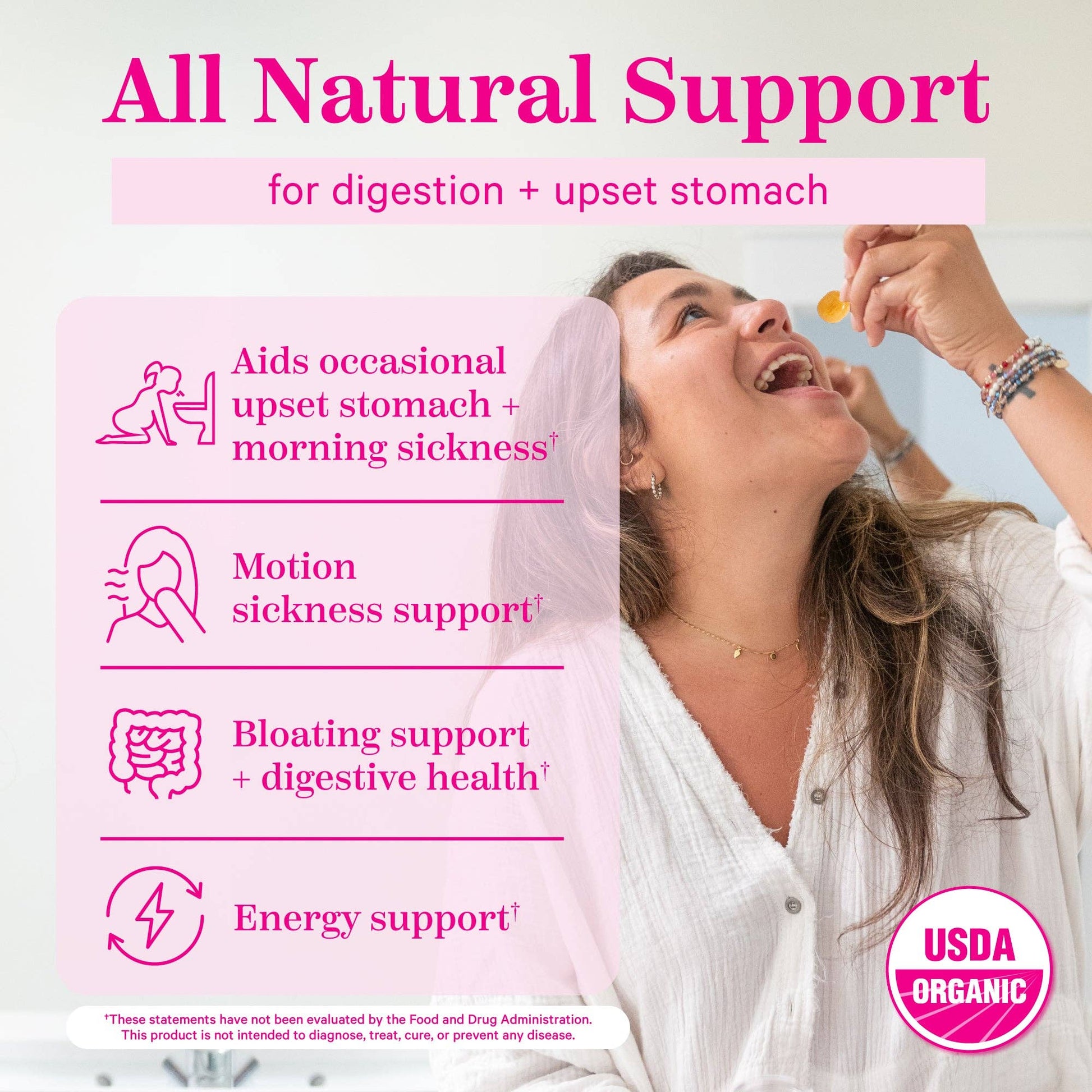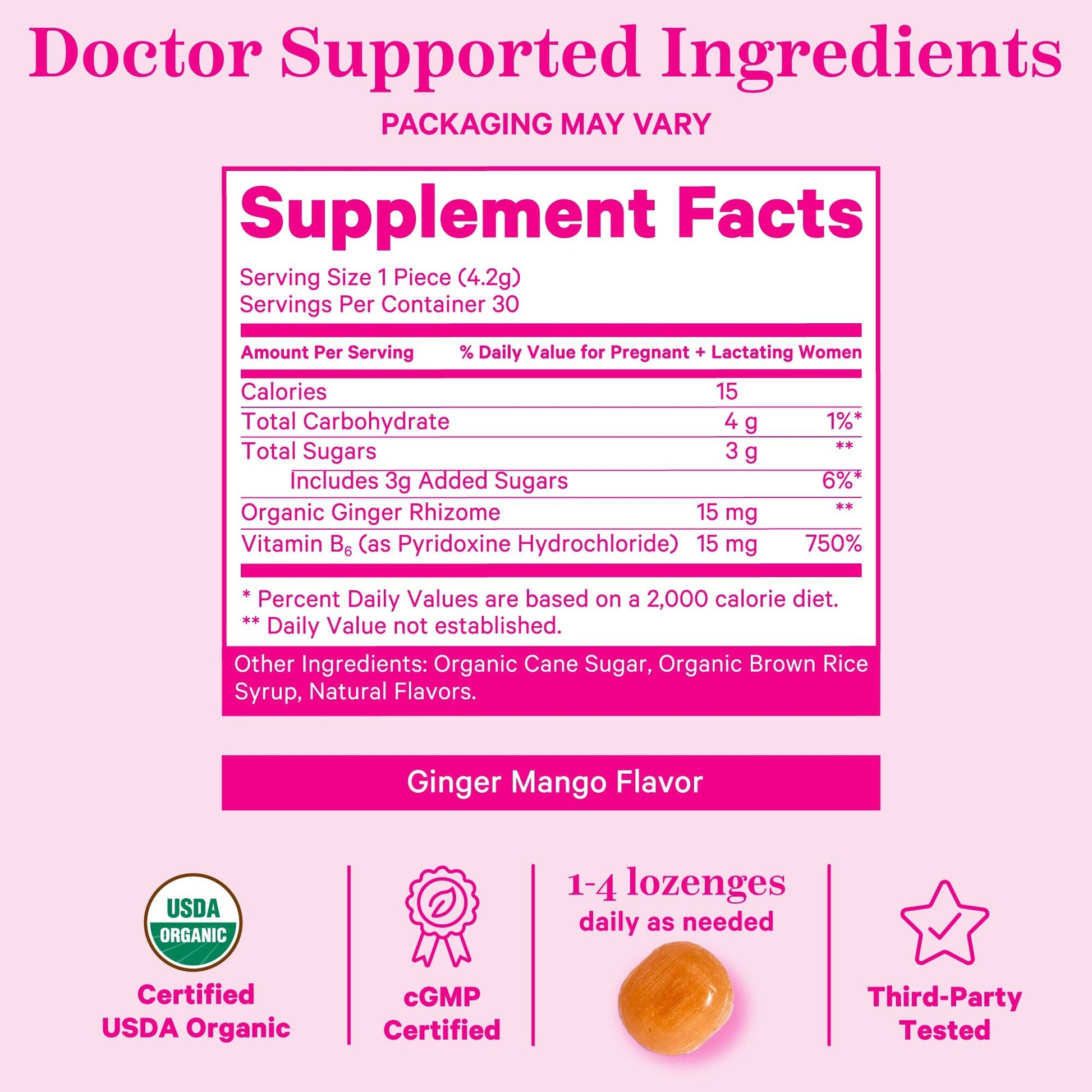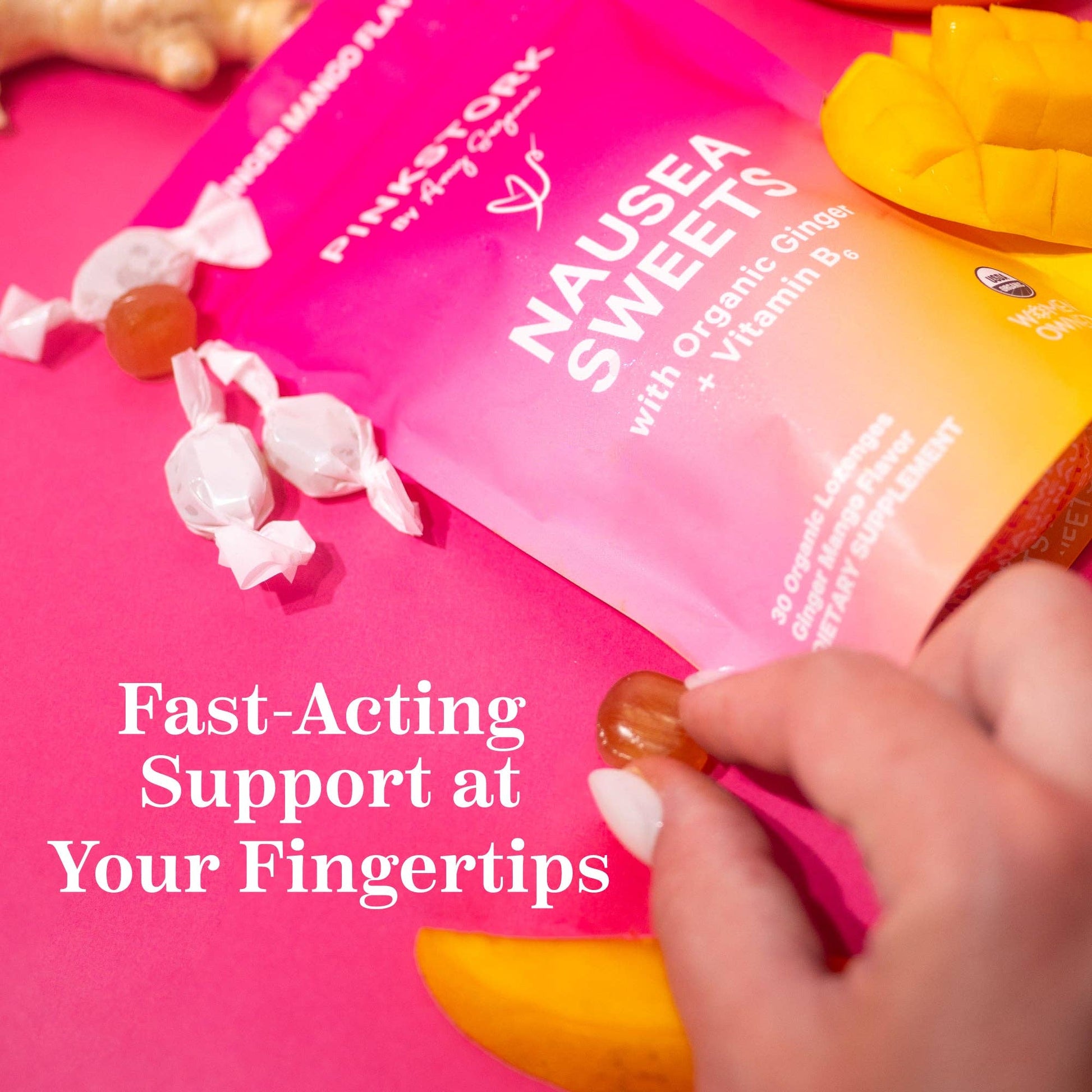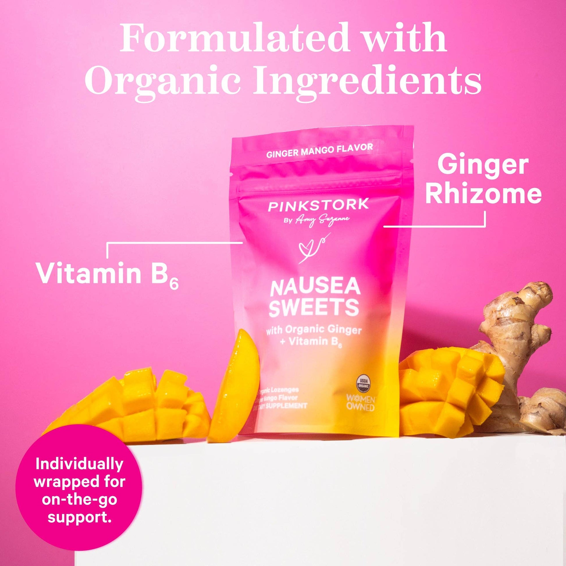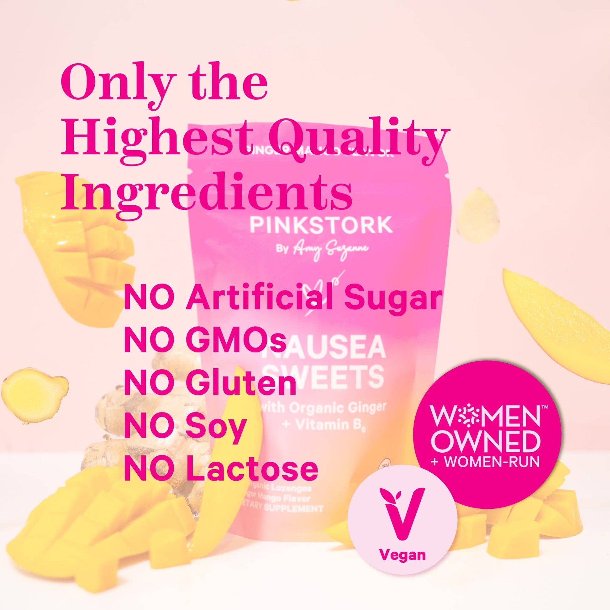 About 70% of women experience morning sickness during pregnancy. Pink Stork Nausea Sweets are formulated with USDA organic peppermint and vitamin B6 support relief from occasional morning sickness and nausea.