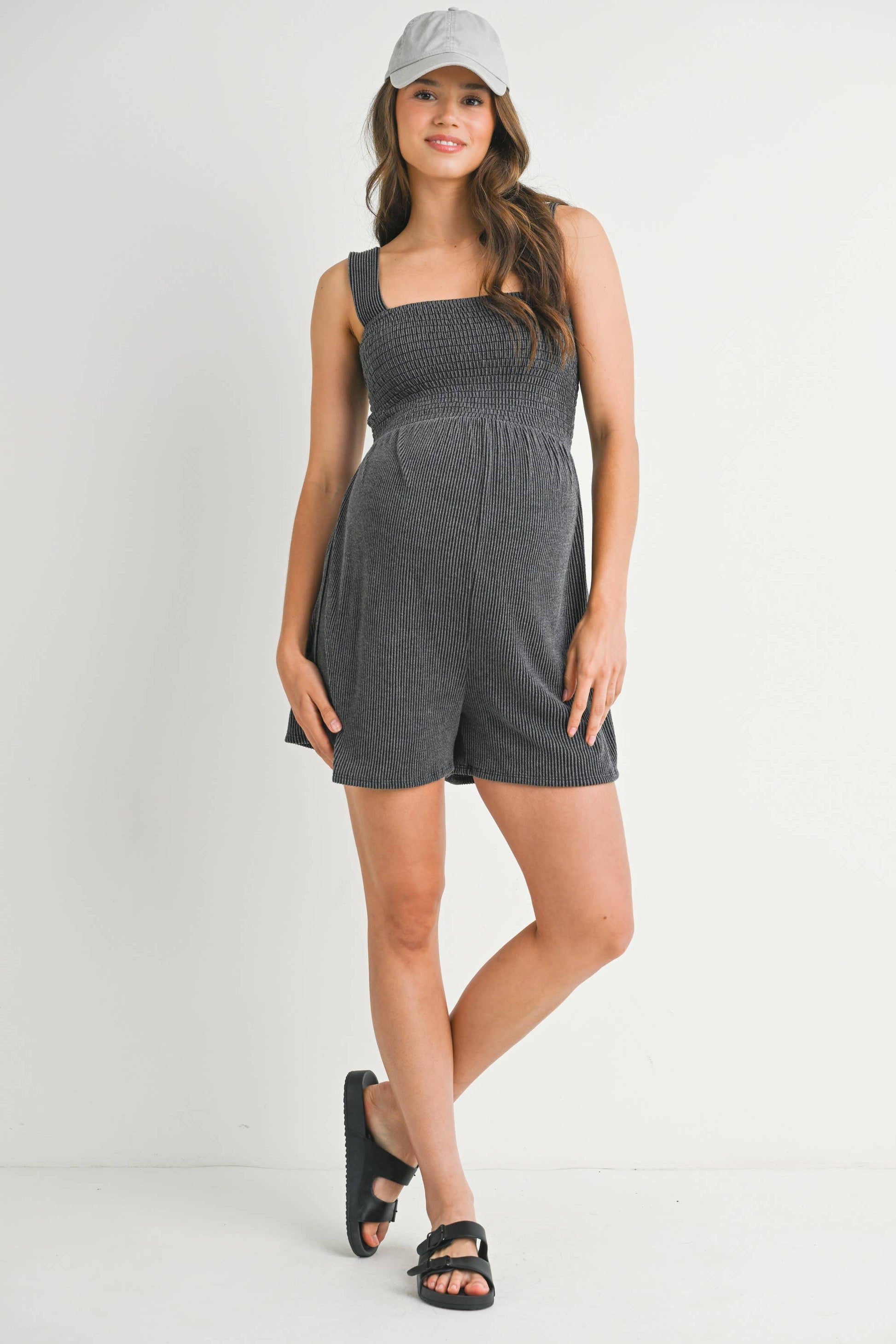 This Maternity Romper features a solid ribbed-knit design with a smocked bodice and square neck. Its stretchy fabric offers superior comfort for warm weather and summer days.
