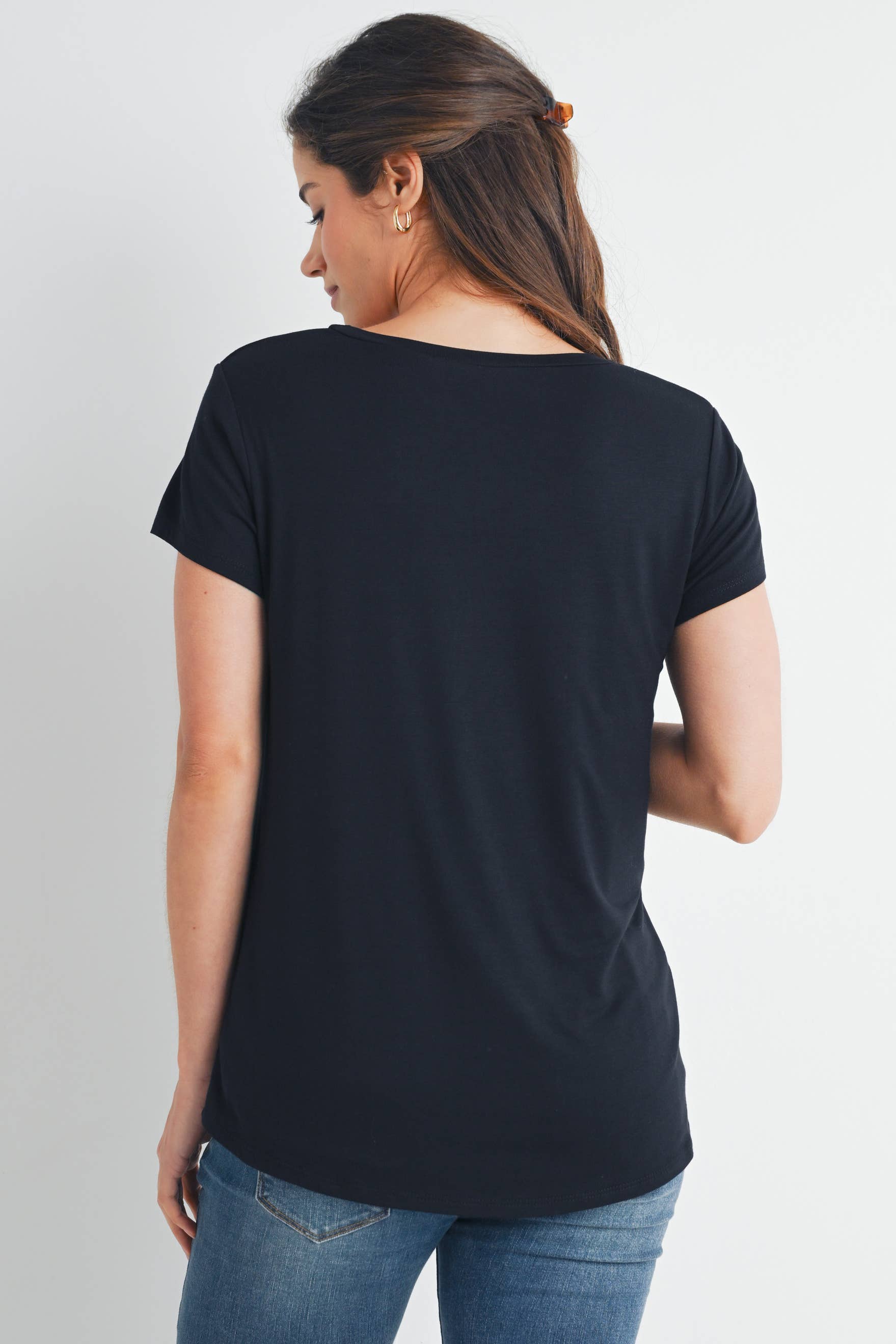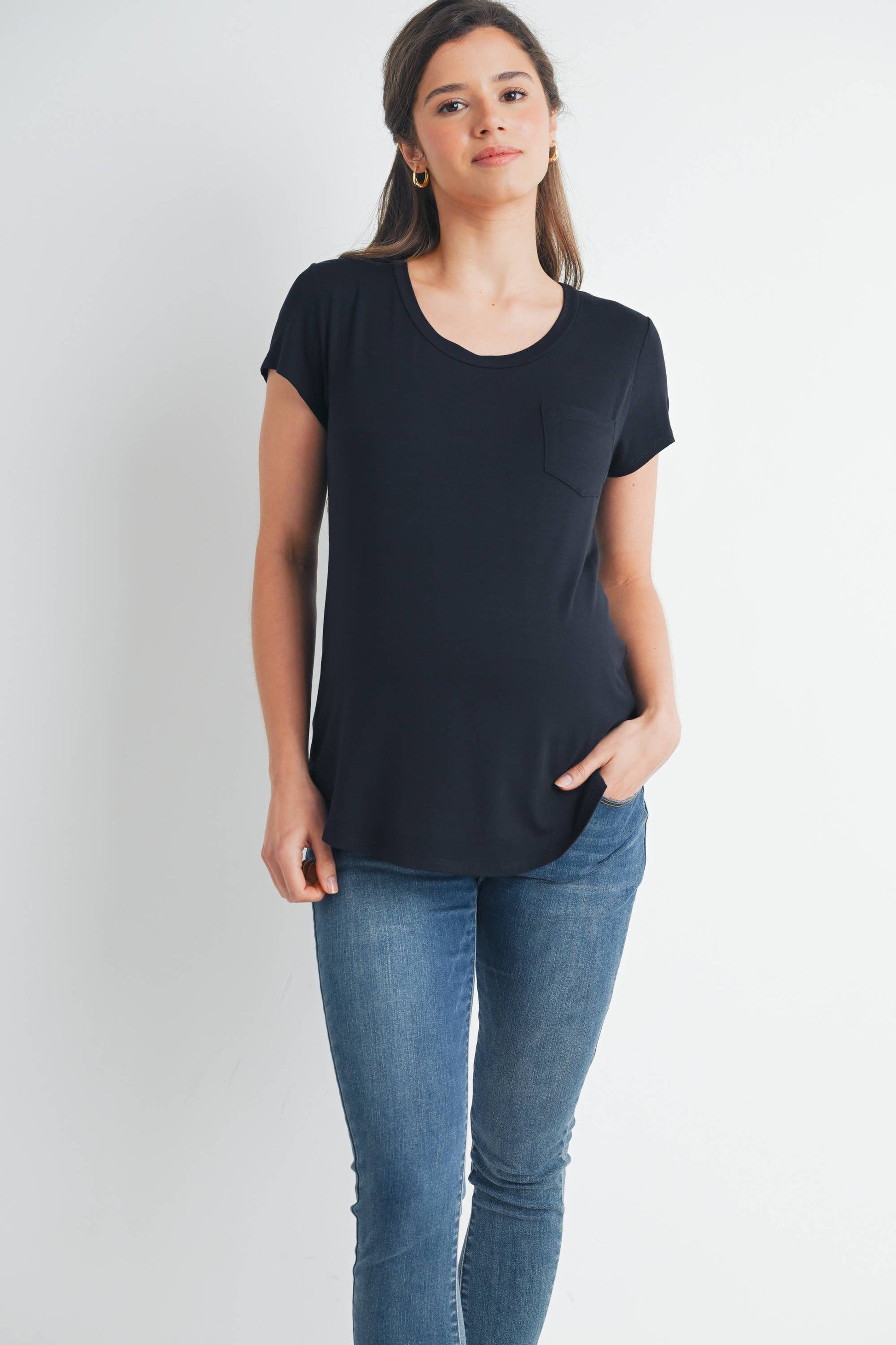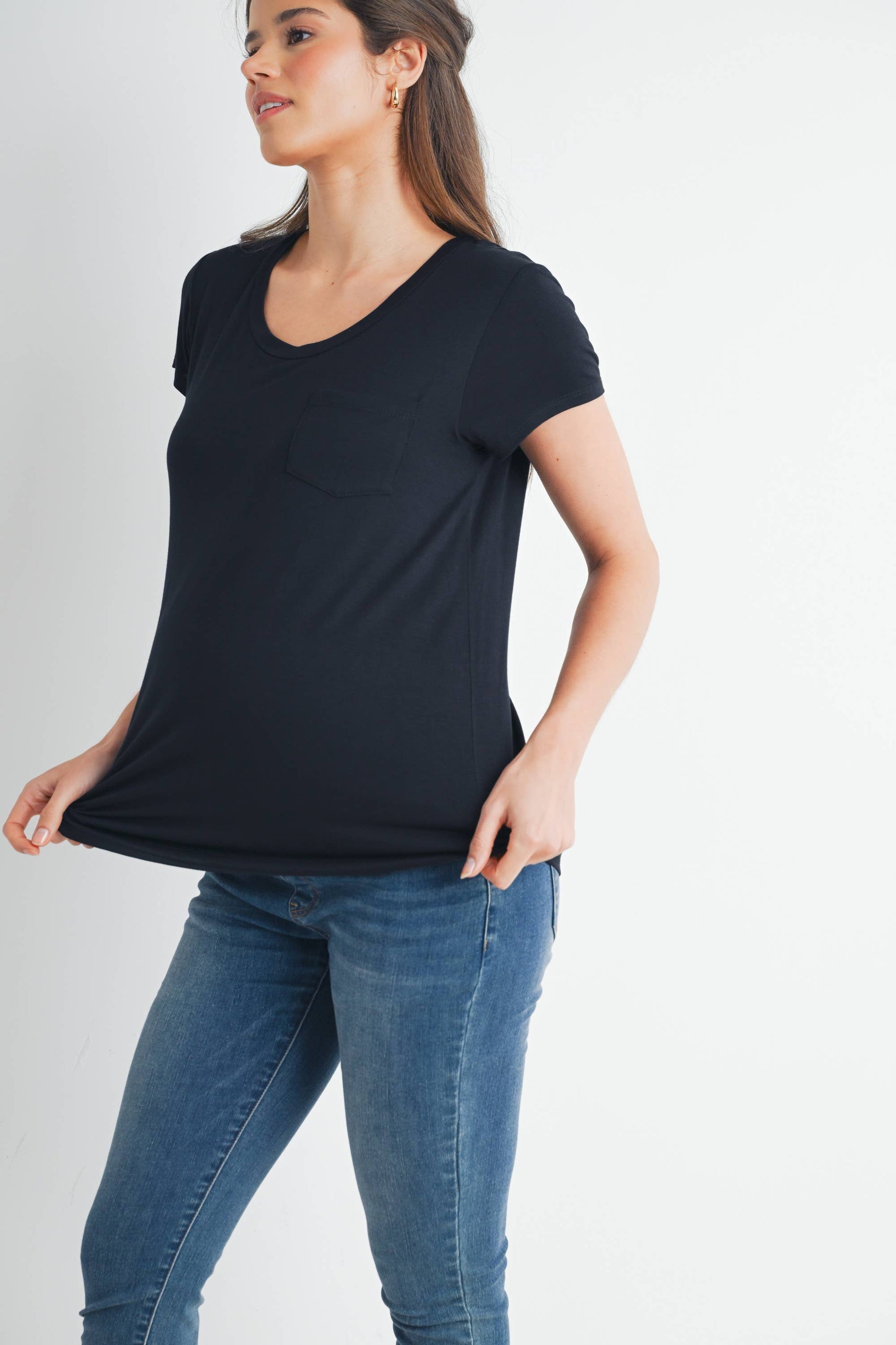 This classic maternity and nursing t-shirt features a round neck, short sleeves, and a front pocket for added style. Its rayon modal fabric offers peekaboo nursing and pumping accessibility, making it extremely discreet and convenient.