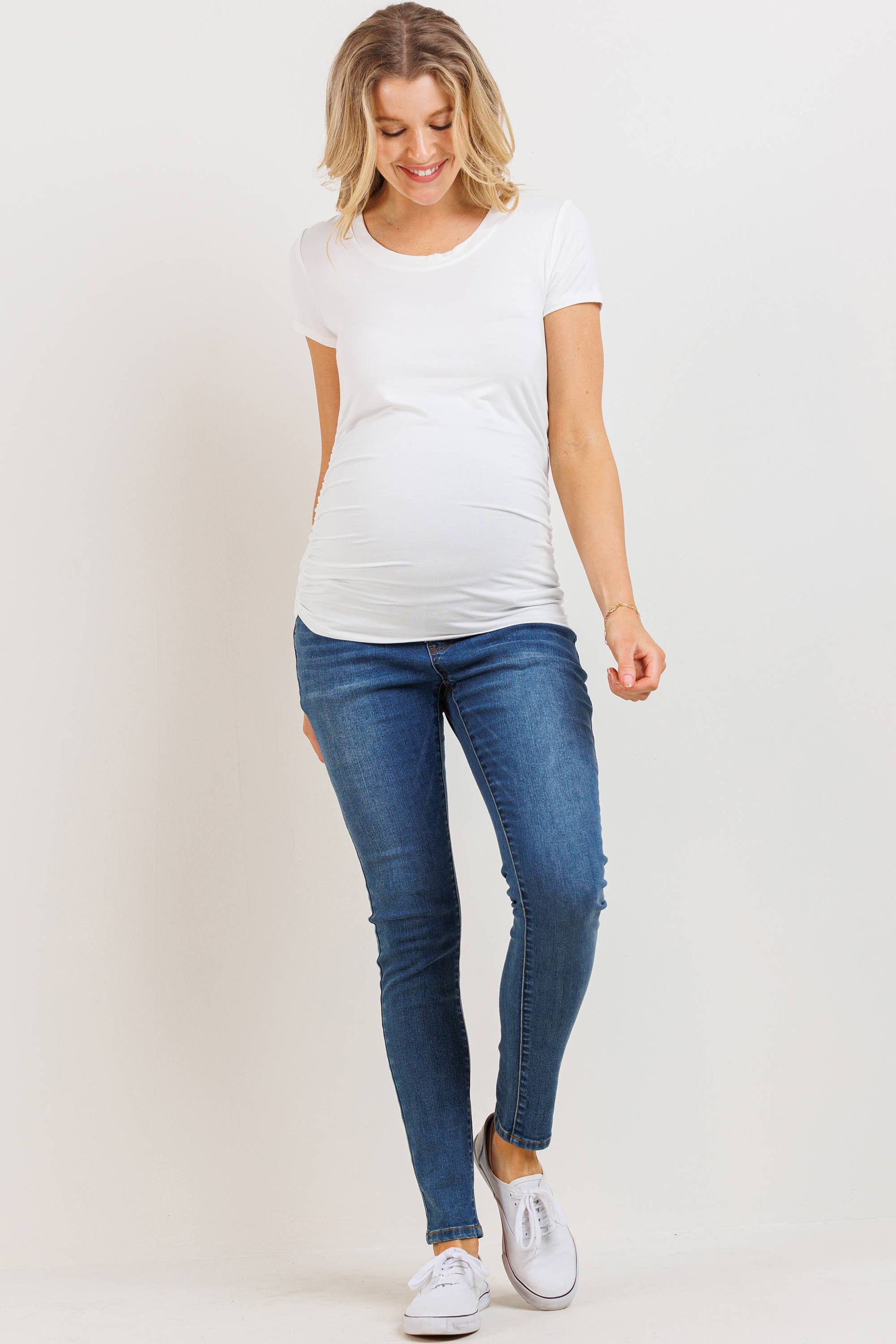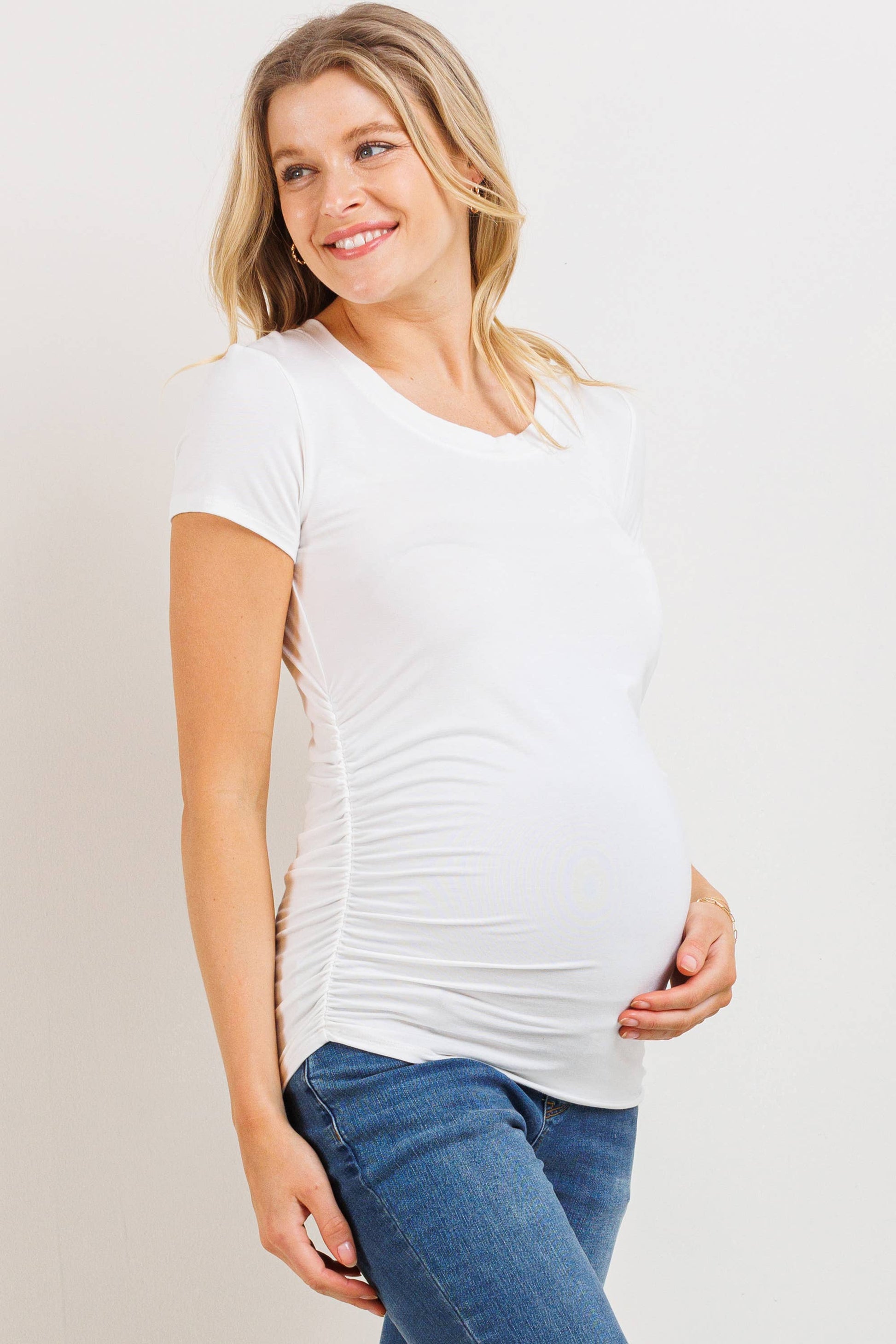 This maternity t-shirt features a round neck design and ruched short sleeves for a stylish and comfortable fit This maternity t-shirt is designed with a round neck and ruched short sleeves to provide both style and comfort. Made with high-quality materials, it is a great addition to any maternity wardrobe.