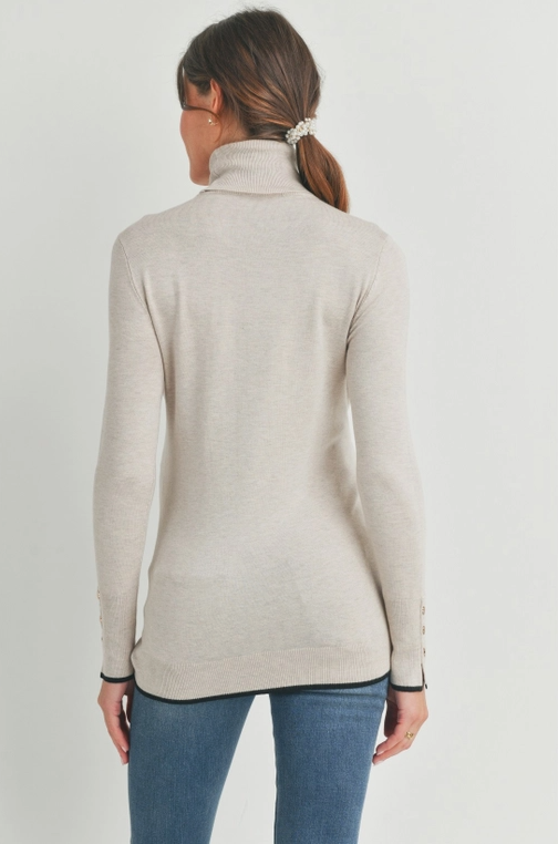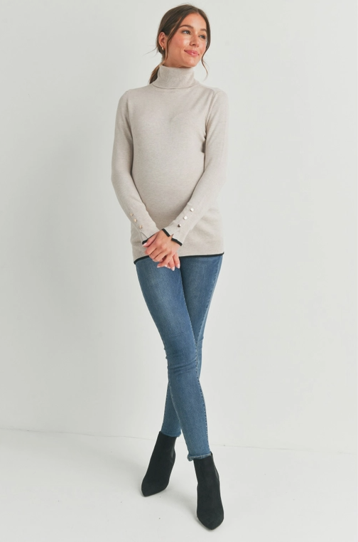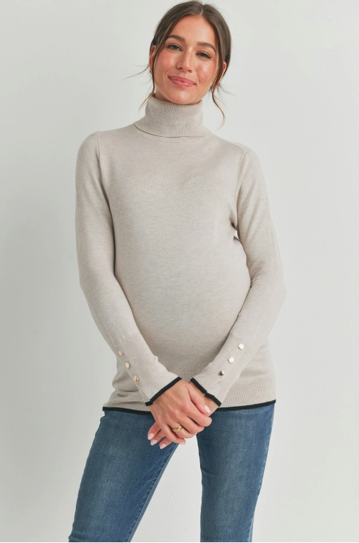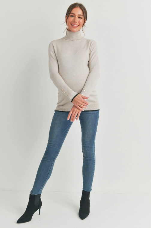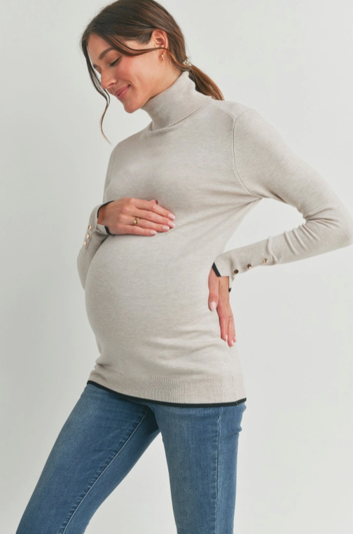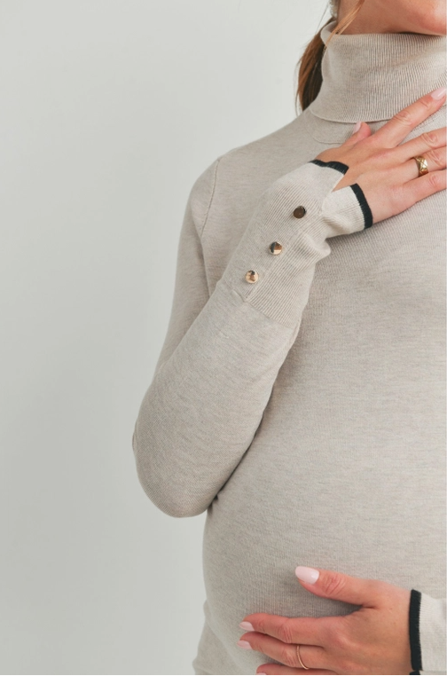 Turtle Neck Maternity Sweater Top offers elevated style with its figure-hugging fit and classic design. Button detail on the sleeve adds versatility, and it's perfect for the working professional. Feel confident and polished in any occasion with this timeless piece.